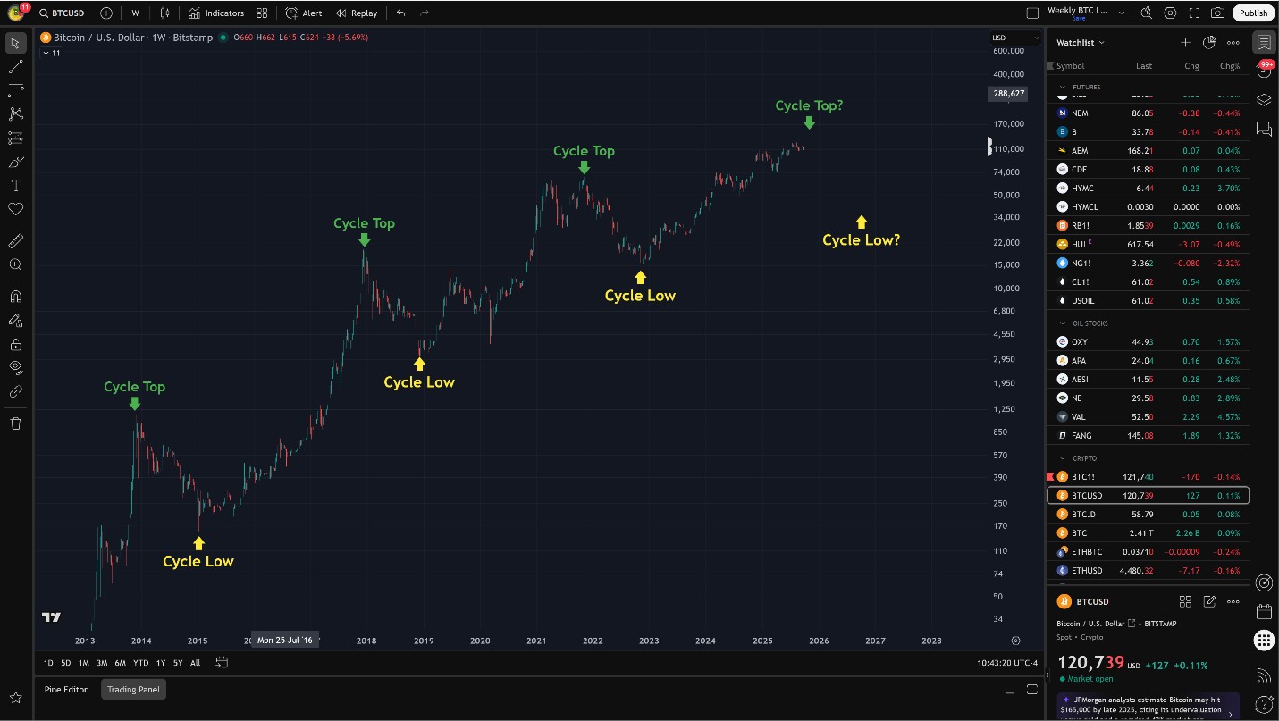 BITCOIN WEEKLY: One aspect I appreciate about Bitcoin is its consistent four-year cycle. Historically, prices have formed major peaks every four years, followed by a bottom 12 months later. The next significant peak is expected before year-end — possibly in the coming weeks — with the subsequent bear market low anticipated around October 2026. In terms of targets, I’m watching for a potential top between $140,000 and $160,000. Historically, Bitcoin has declined over 70% from its four-year cycle peaks.