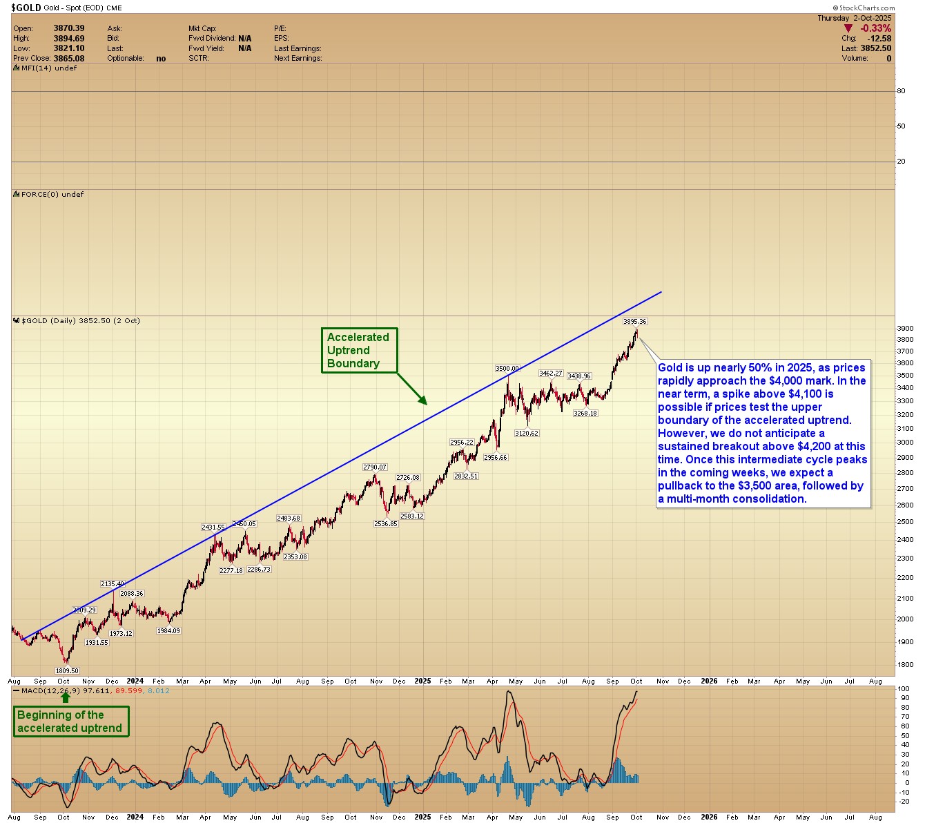 GOLD: Gold is up nearly 50% in 2025, as prices rapidly approach the $4,000 mark. In the near term, a spike above $4,100 is possible if prices test the upper boundary of the accelerated uptrend. However, we do not anticipate a sustained breakout above $4,200 at this time. Once this intermediate cycle peaks in the coming weeks, we expect a pullback to the $3,500 area, followed by a multi-month consolidation.