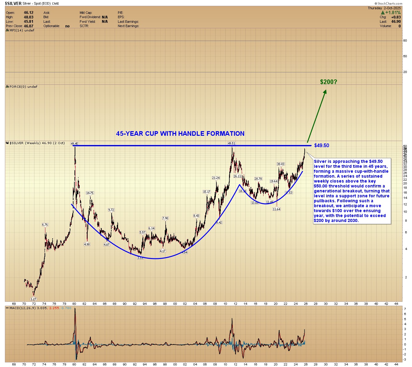 SILVER WEEKLY: Silver is approaching the $49.50 level for the third time in 45 years, forming a massive cup-with-handle formation. A series of sustained weekly closes above the key $50.00 threshold would confirm a generational breakout, turning that level into a support zone for future pullbacks. Following such a breakout, we anticipate a move towards $100 over the ensuing year, with the potential to exceed $200 by around 2030.