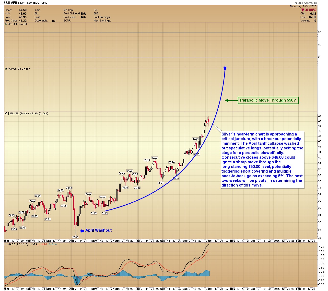 However, before gold tops, a breakout above $50.00 is possible in silver. Progressive closes above $48.00 could set the stage for a blowoff rally.