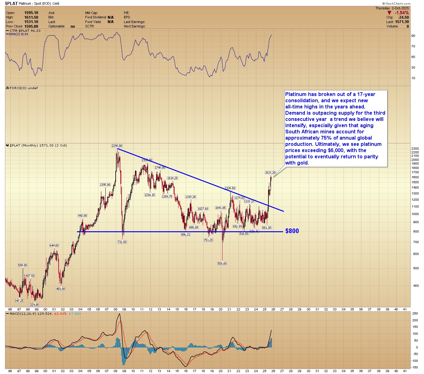 PLATINUM MONTHLY: Platinum has broken out of a 17-year consolidation, and we expect new all-time highs in the years ahead. Demand is outpacing supply for the third consecutive year — a trend we believe will intensify, especially given that aging South African mines account for approximately 75% of annual global production. Ultimately, we see platinum prices exceeding $6,000, with the potential to eventually return to parity with gold.
