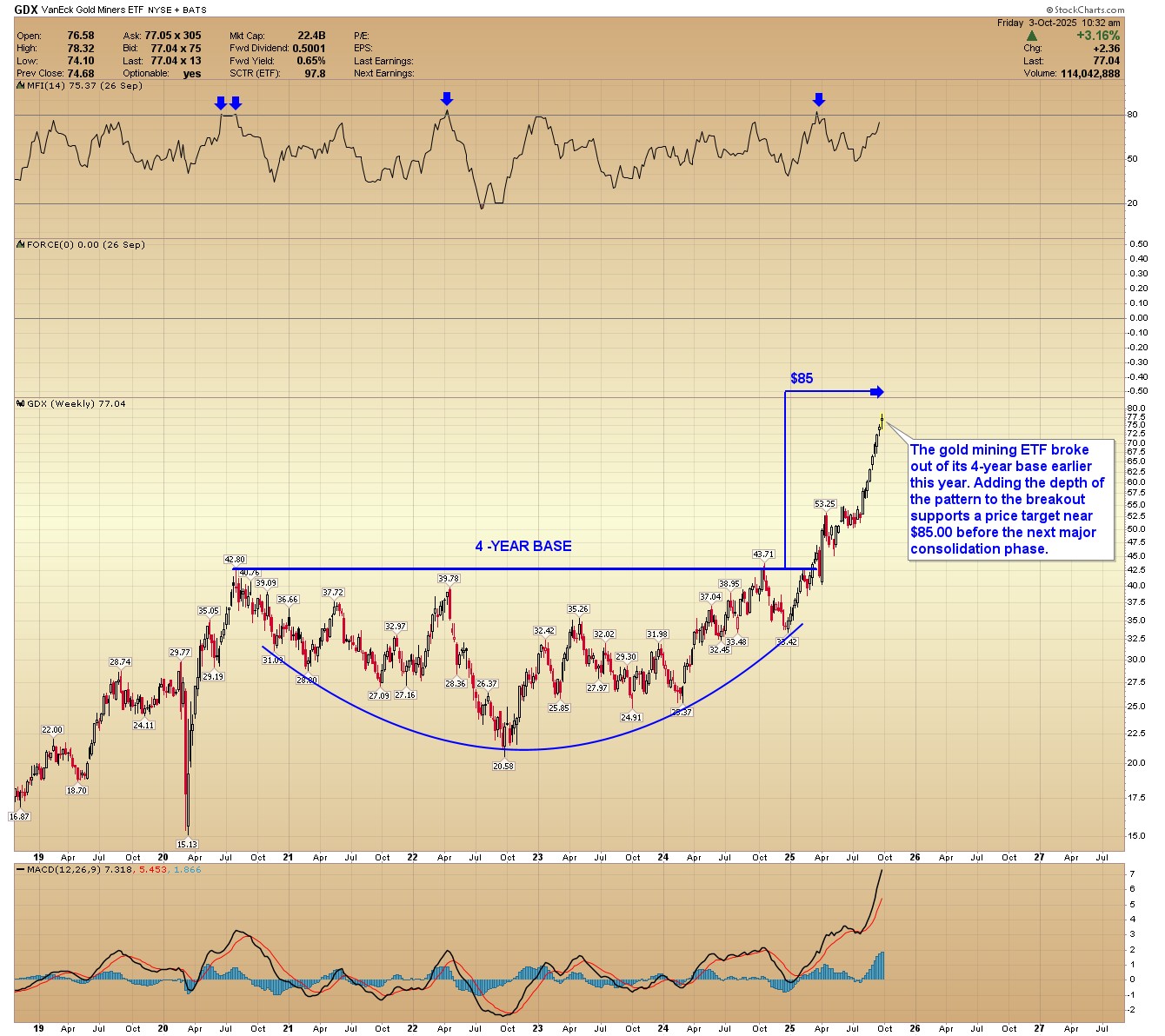 GDX WEEKLY: The gold mining ETF broke out of its 4-year base earlier this year. Adding the depth of the pattern to the breakout supports a price target near $85.00 before the next major consolidation phase.