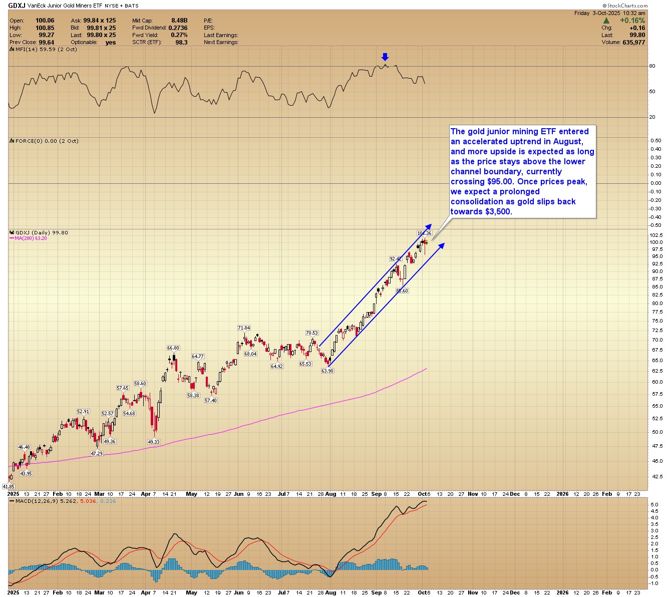 GDXJ: The gold junior mining ETF entered an accelerated uptrend in August, and more upside is expected as long as the price stays above the lower channel boundary, currently crossing $95.00. Once prices peak, we expect a prolonged consolidation as gold slips back towards $3,500.