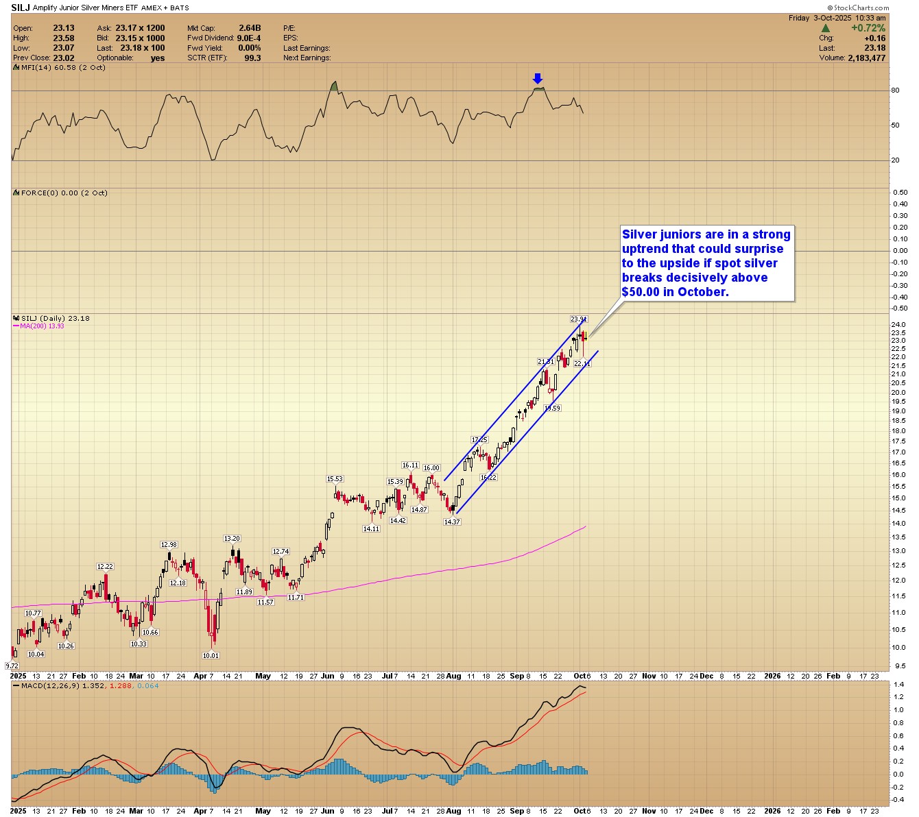 SILJ: Silver juniors are in a strong uptrend that could surprise to the upside if spot silver breaks decisively above $50.00 in October.