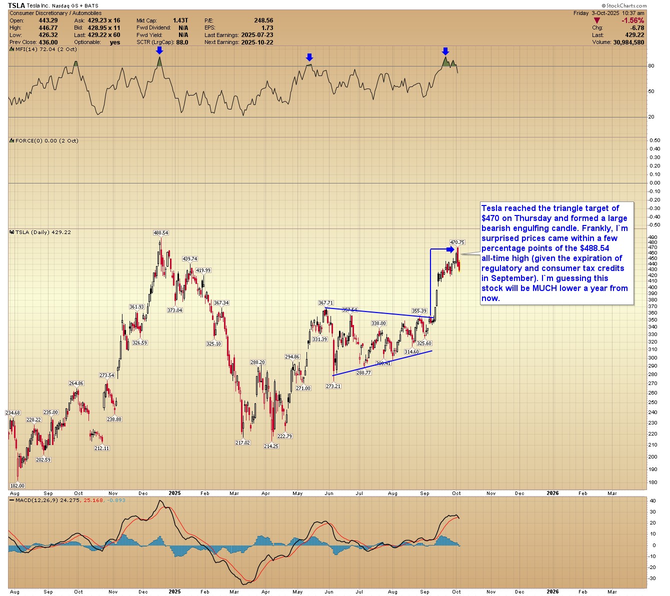 TSLA: Tesla reached the triangle target of $470 on Thursday and formed a large bearish engulfing candle. Frankly, I’m surprised prices came within a few percentage points of the $488.54 all-time high (given the expiration of regulatory and consumer tax credits in September). I’m guessing this stock will be MUCH lower a year from now.