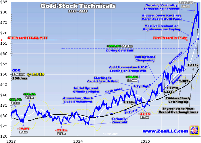 Late last week, the leading GDX gold-stock ETF soared to another dazzling all-time-record-high close of $84.44. GDX had skyrocketed an epic 149.0% year-to-date on a parallel massive 64.5% gold surge! That’s wonderful to see, a magnificent reversal from gold stocks’ dreadful underperformance last year. In 2024 GDX only eked out a 9.4% gain despite gold’s powerful 27.2% rally, for horrendous 0.3x upside leverage.