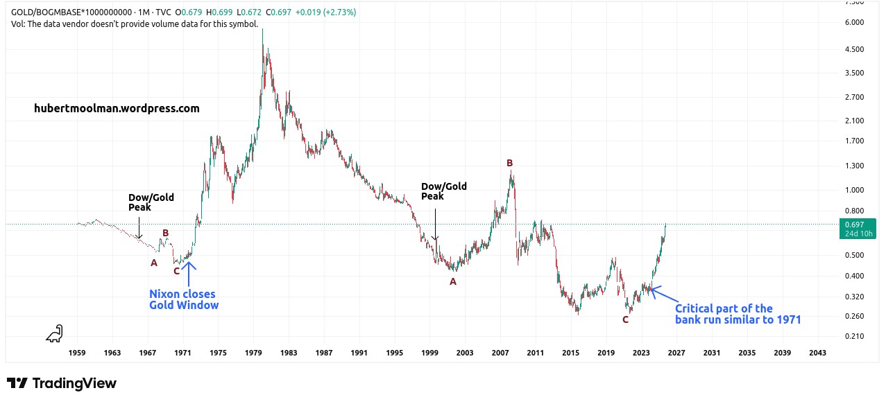 It can be described as very similar to the events since Nixon ended the direct convertibility to gold in 1971. In the Gold/Monetary Base chart (below) you can see currently how a similar pattern has developed to the 1971 end of convertibility.