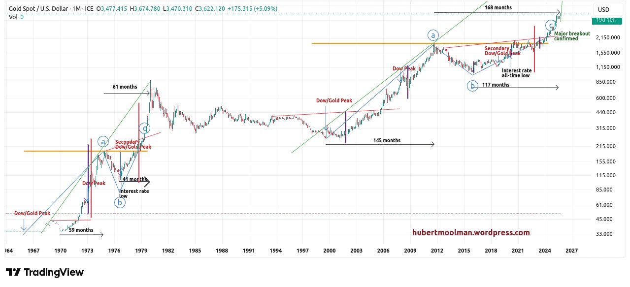 I have marked out two patterns that show how the recent breakout puts gold in the acceleration phase of the bull market.