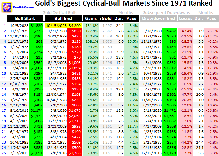 Gold’s current mighty cyclical bull was born in early October 2023 near $1,820 per ounce.  As of this Wednesday’s $4,209 close, gold has soared a phenomenal 131.3% in the 24.4 months since!  That is its biggest cyclical bull on record, besting January 1980’s climax up 127.9% in just 2.6 months!  While my spreadsheet is big and complex slicing up all gold’s 10%+ moves in multiple ways, here are its top bulls ranked.