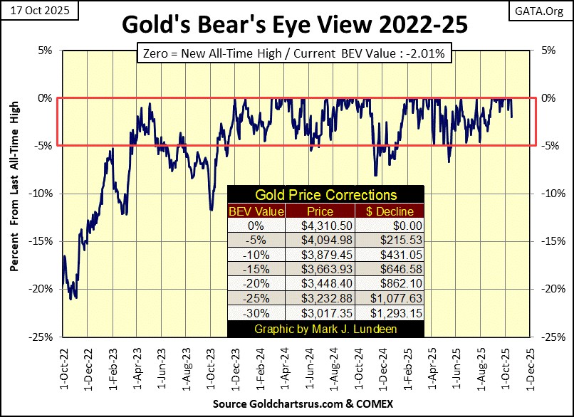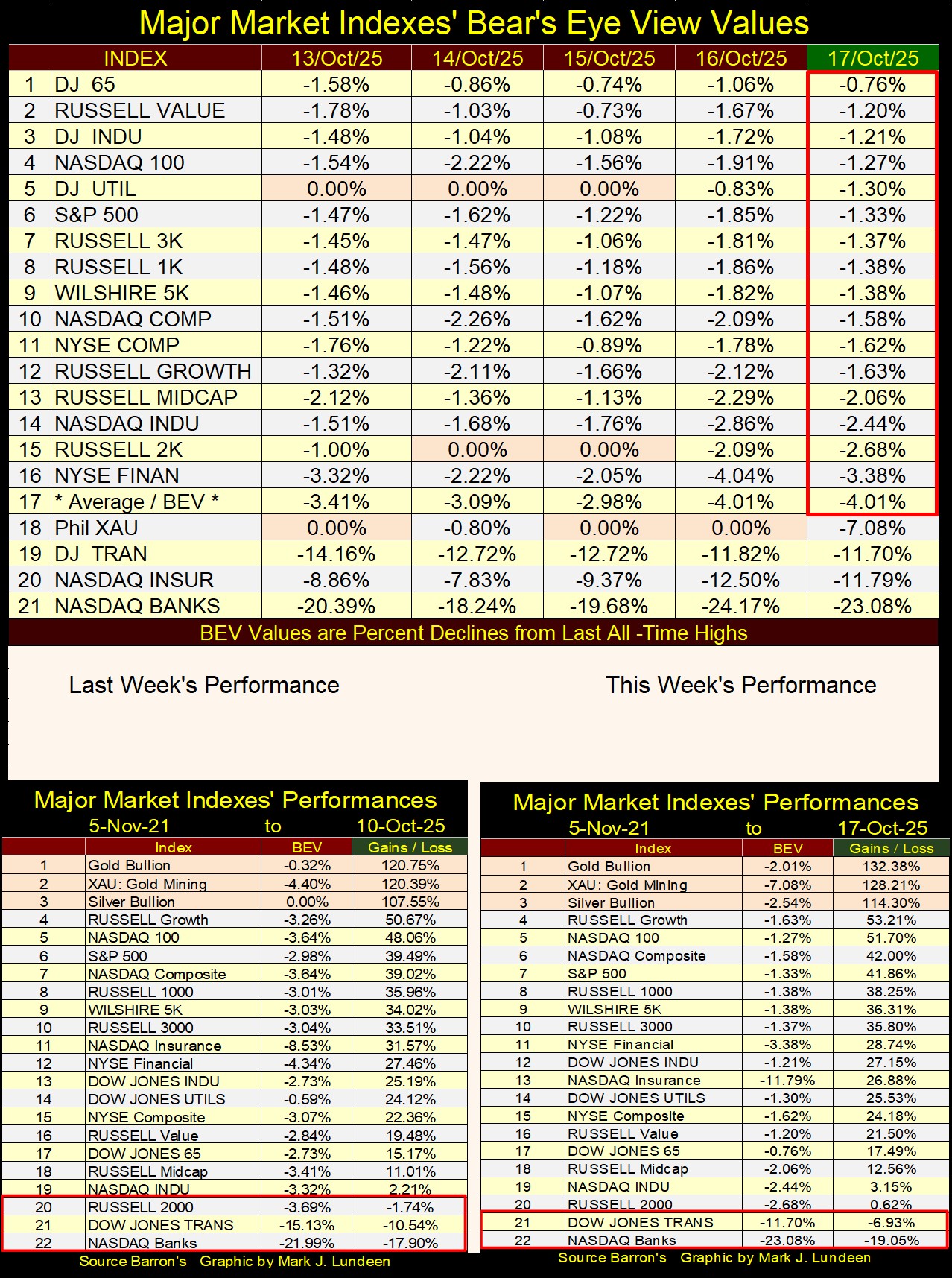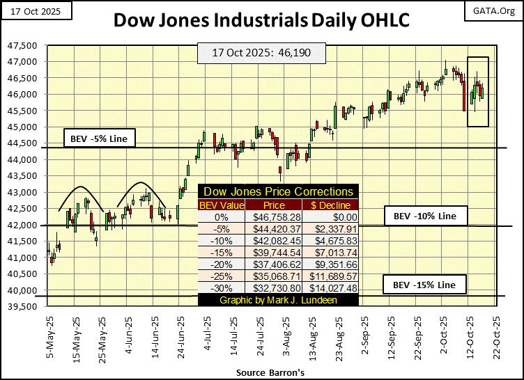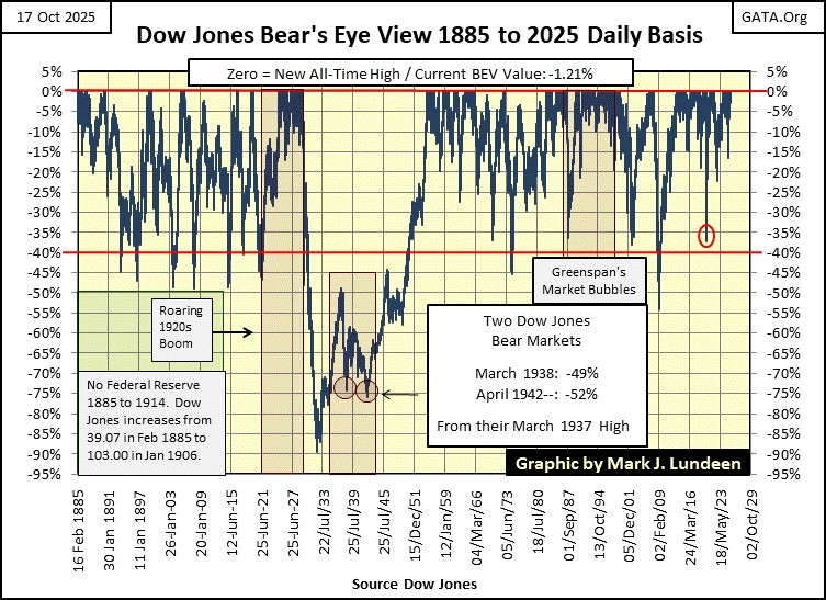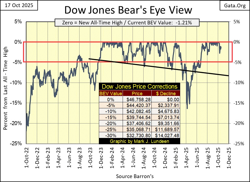 In the last two years, the Dow Jones has generated sixty-six new all-time highs, an advance that has taken the Dow Jones up from 34,947 on 17 November 2023, when the Dow Jone first closed in scoring position (above its BEV -5% line in its BEV chart below), to 46,758 on October 3rd this year. That is an advance of 11,811 points, or a two-year gain of 33.79%. Though, that is something a Bear’s Eye View Chart would not see, as it sees each new all-time high as only a 0.0%, and never more. Daily closes not at a new all-time high, are seen as negative percentage claw-backs from their last all-time high.