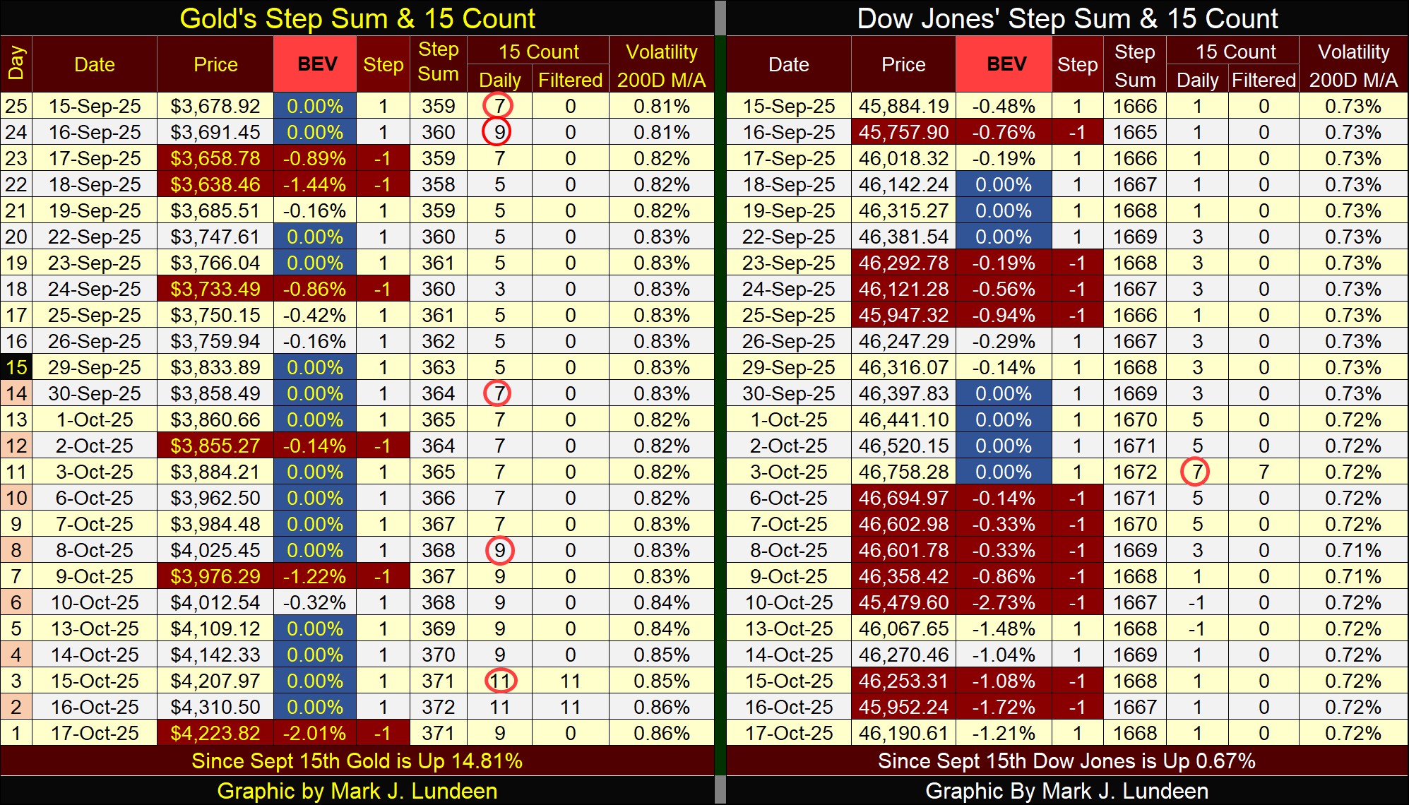 On the Dow Jones side of the step sum table, we see what should happen when a market’s 15-count becomes overbought with a +7; it takes a break by selling off a bit. Look at gold, this week its 15-count hit an extremely overbought +11, which should tell us gold is way overdue for a sell off. But I have this feeling, that the gold market isn’t going to sell off anytime soon.