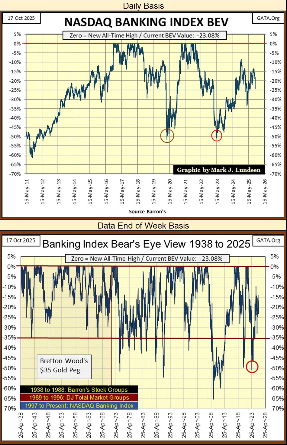Stepping back in time, via the Bear’s Eye View of my banking index data above, before August 1971, before the US Government took the dollar off the Bretton Woods’ $35 gold peg, corrections for these banks bottomed with a 35% market decline. And from 1938 to 1971, the banks saw a 35% bear market bottom only twice during these thirty-three years.