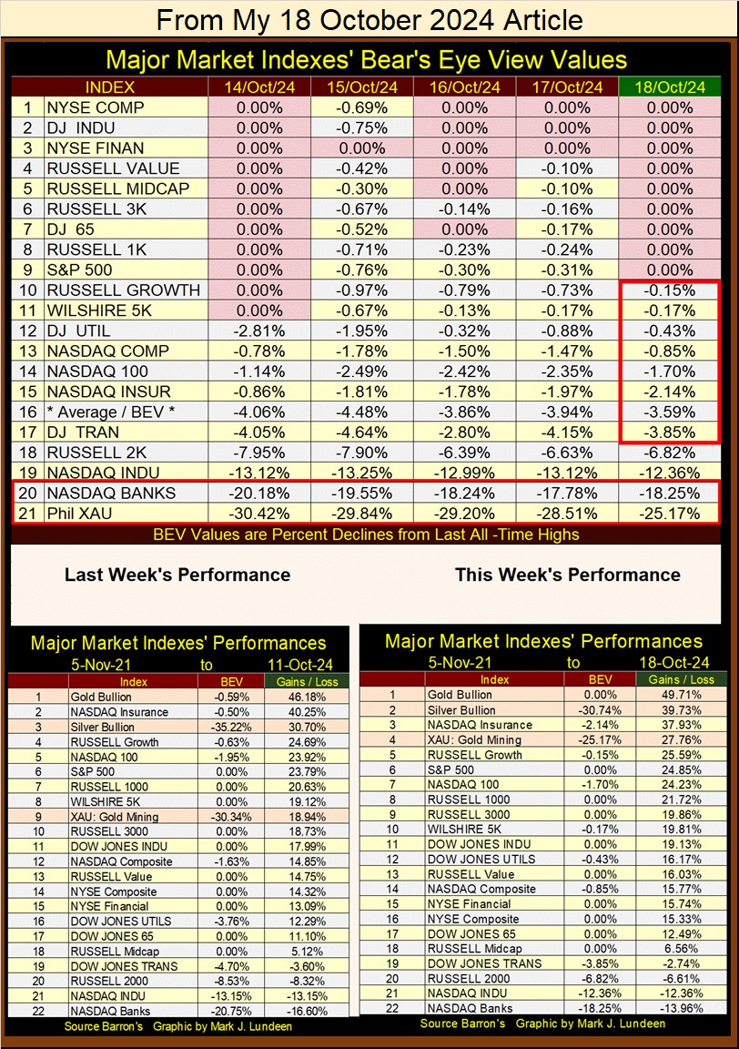 What do I know? Maybe these banks will once again be making new all-time highs, exactly like the other major-market indexes I follow. And then; maybe not. And if not; what then? If they break below their BEV -50% line, as they have twice since 2020, what will the rest of the stock market do? Maybe the reason gold, silver and their miners have done so well in the past year, is because these banks have done so poorly.