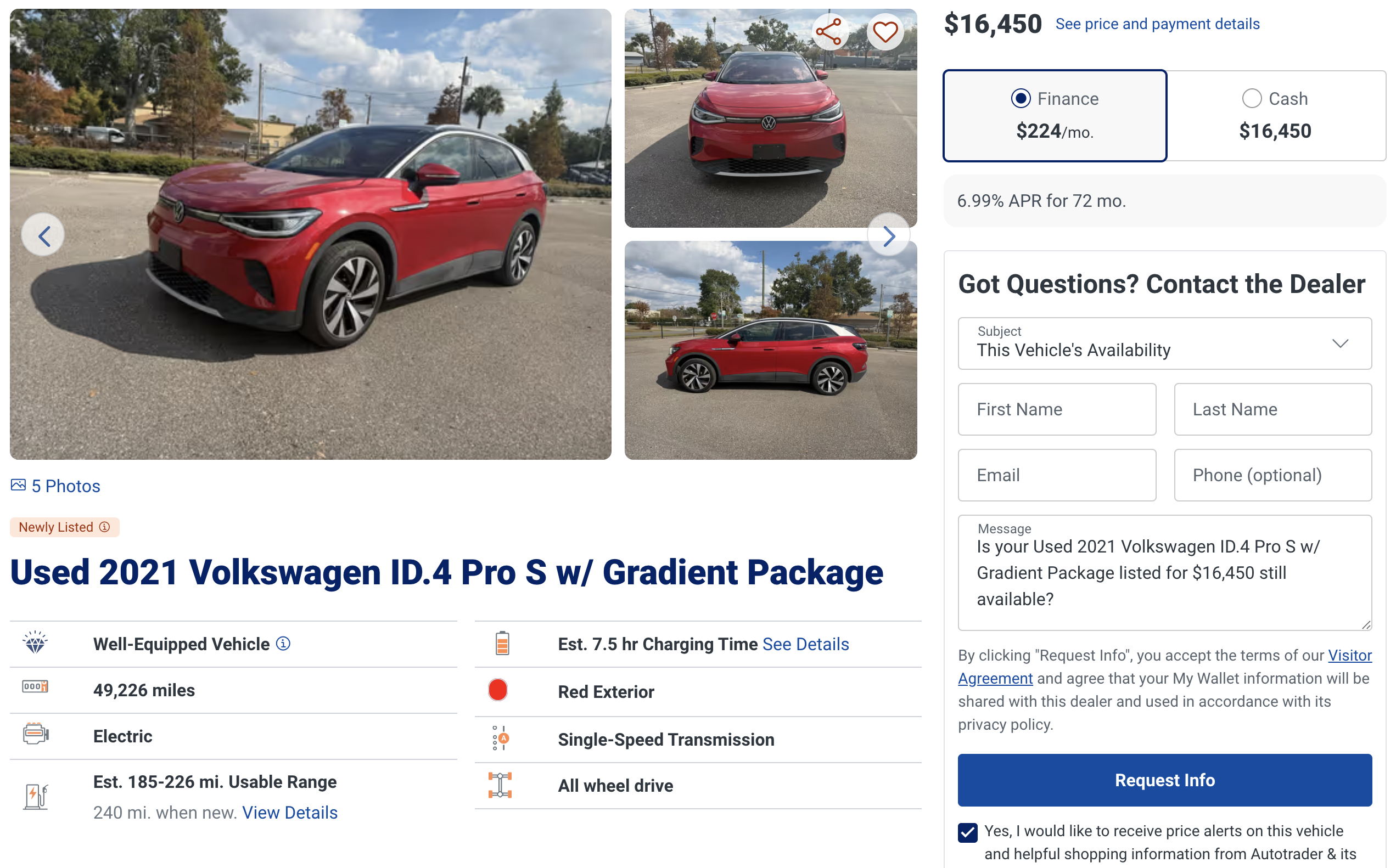 Starting with the Volkswagen ID.4, in February I found a 2021 Volkswagen ID.4 Pro S in my area with 27,844 miles on it for just $21,495. Looking today, here are some similar vehicles I found on Autotrader: