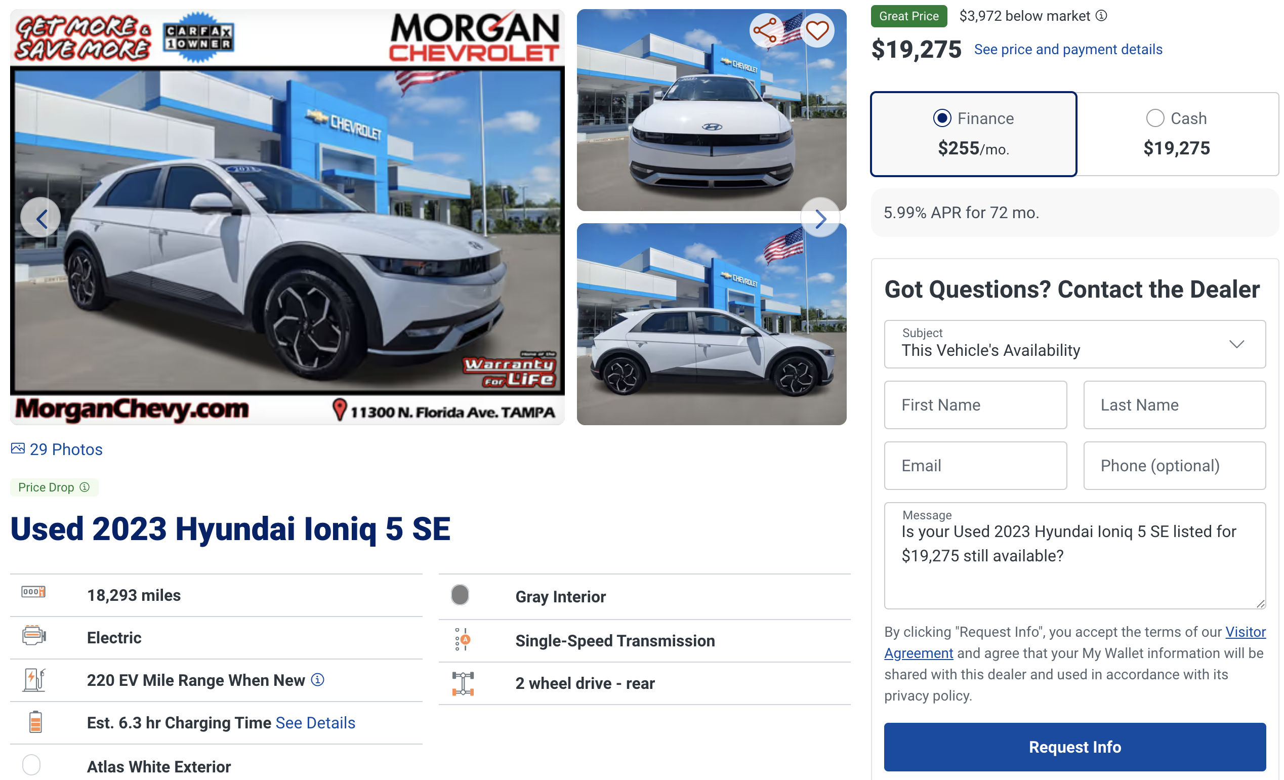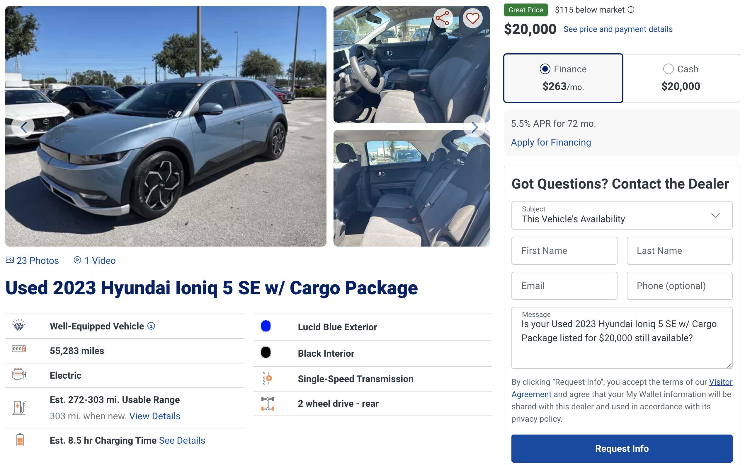 If we go up a little bit in terms of model year, from 2022 to 2023 — but, admittedly, select a car with about 80 miles less range (but also more than 20,000 fewer miles on it) — we find an option with about the same price as the February find.