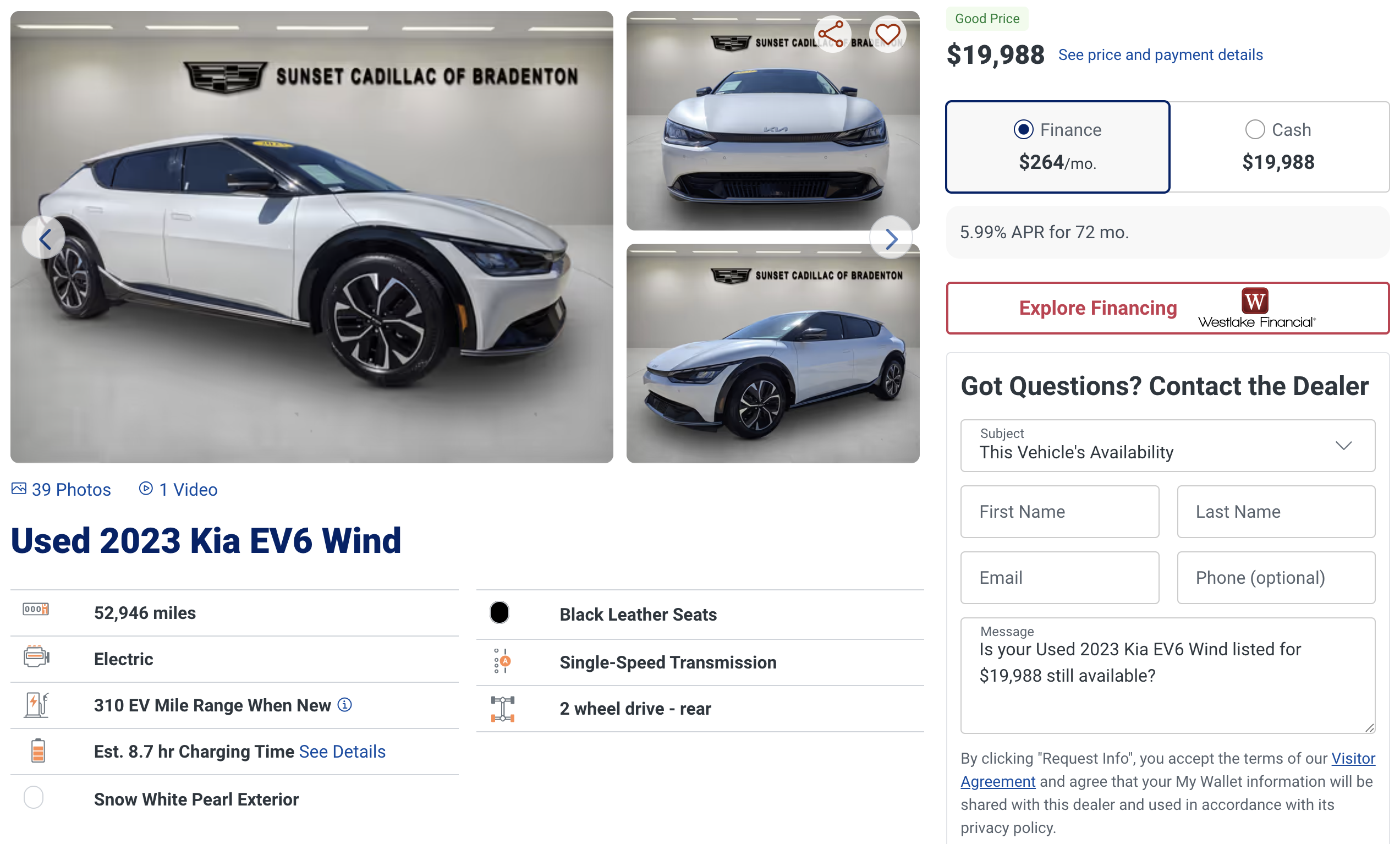 Last but not least, let’s check out some Kia EV6 options. Here’s what I wrote in February: “I found a few models under $25,000, and several with more miles just above that marker, but here’s the one I’d highlight: 26,090 miles, 2022 Kia EV6 Wind, for just $21,998. Yes, please!”