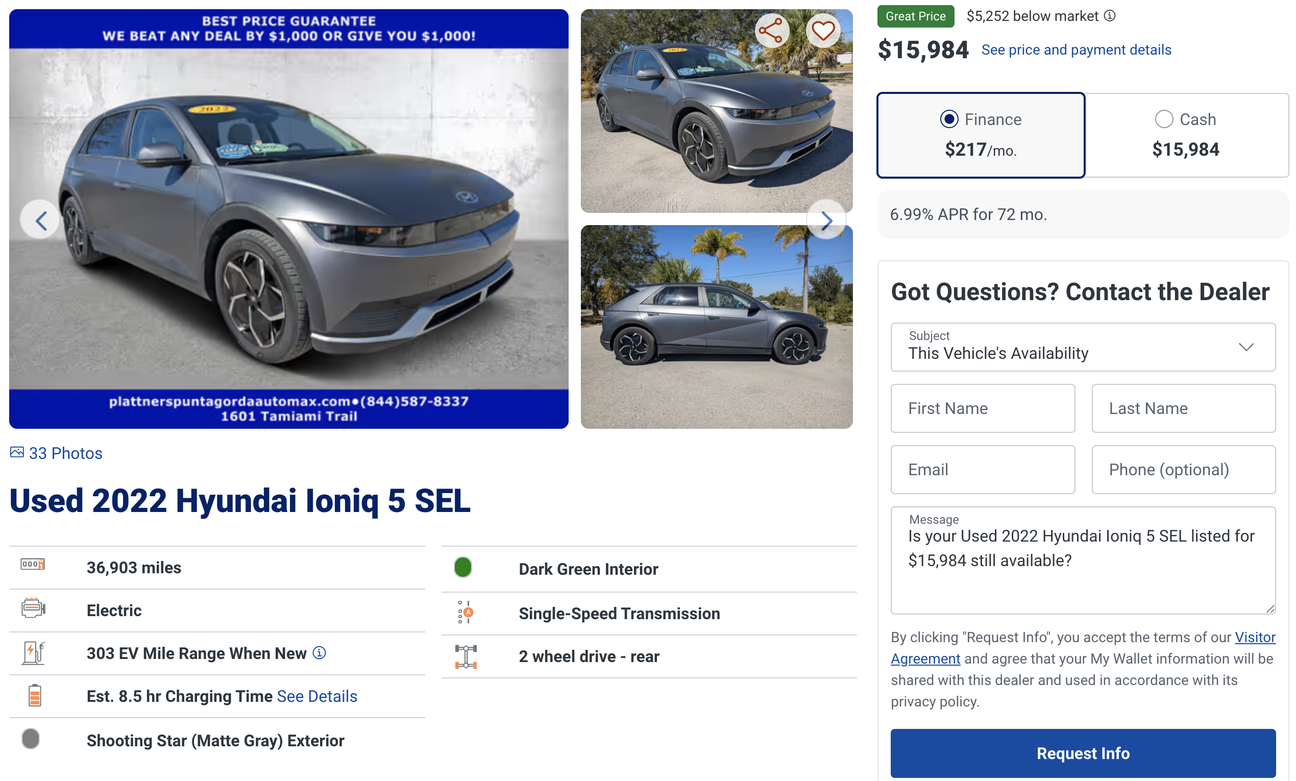 This car is the same year as the one I found earlier in 2025, is an SEL instead of an SE, and has 37,000 miles instead of 42,000, among other small differences. But it costs ~$16,000 instead of ~$20,000. That’s basically a straight $4,000 cut!