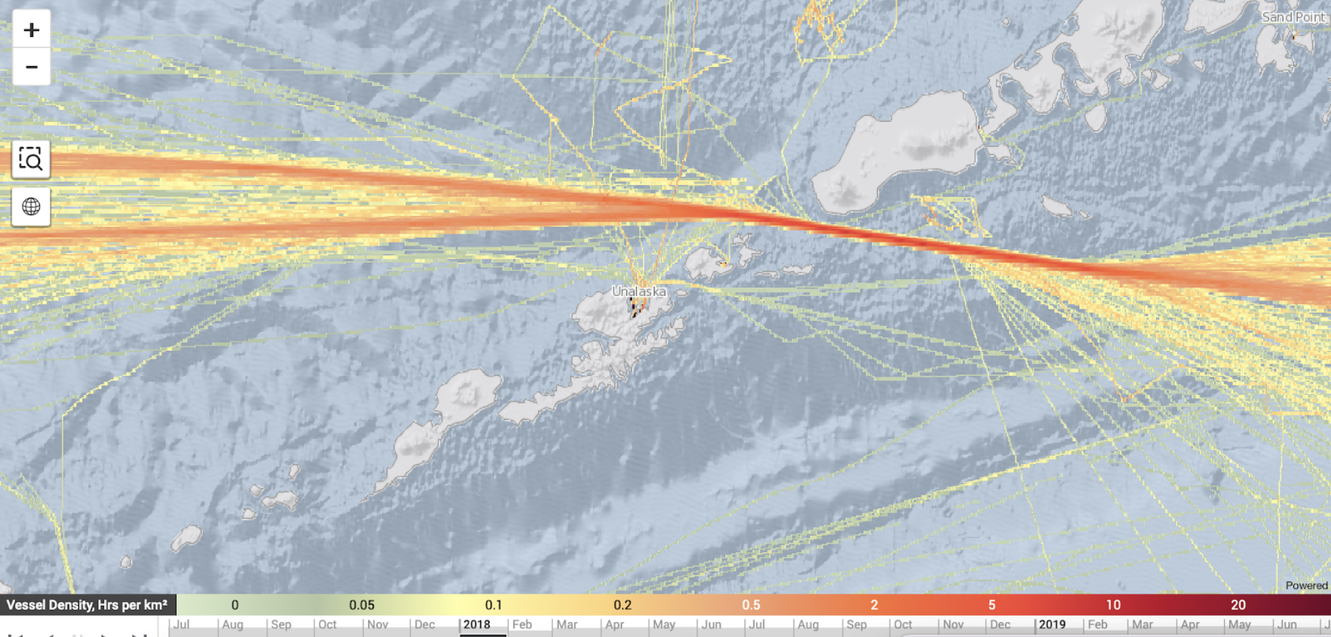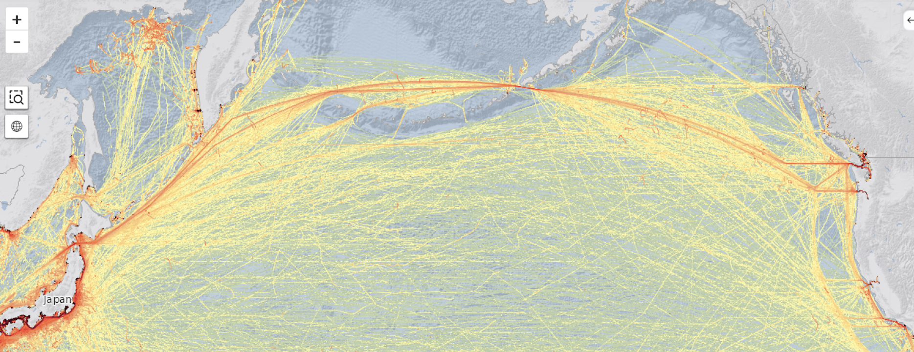 Cross-Pacific transport from North America to Japan is more challenging, with a nonstop distance of 7,000 km from Seattle to Japan, requiring energy transfer at ports en route. Existing traffic from San Francisco north travels steadily year round through the Aleutians, passing near Dutch Harbor in the Aleutians, shown in Figure 4, on routes to Korea, Japan, and China. This is the shortest distance from Seattle to Japan. The longest open water Pacific distance from Dutch Harbor to the Port of Hakodate in Hokkaido, Japan, is about 4,000 km. This trip may be navigated by ships with 5,000 km of range by recharging or swapping at Dutch Harbor. The distance from Seattle, Washington, to Dutch Harbor is 3,134 km. Figure 2 shows cross-Pacific cargo traffic density on 1-18. Traffic from the Port of LA splits in July and August, shown in Figure 3, with part heading north along the coast toward the Aleutians and part heading further south. The rest of the year it predominantly follows the coast up to Seattle and goes the north route past Dutch Harbor.