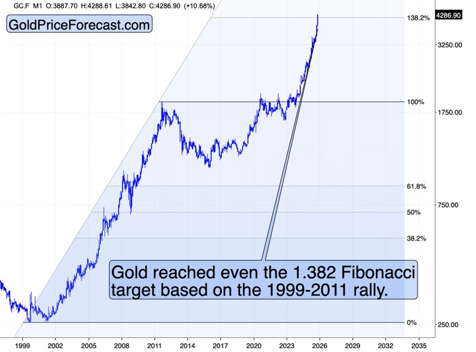 On the above chart, we see that gold moved to – and even a bit above – its 1.382 Fibonacci extension based on the 1999 – 2011 bull market.