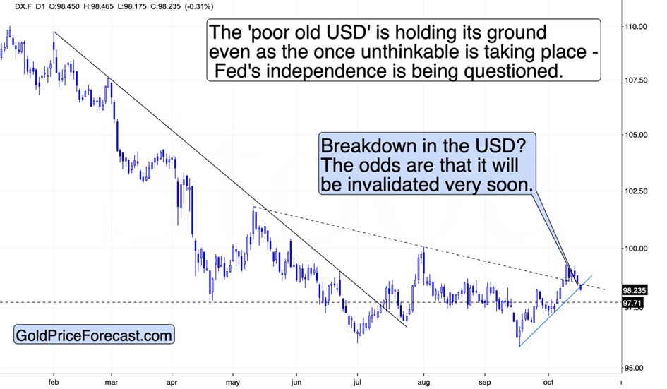 It’s also at – actually a bit above – the upper border of its very long-term, rising trend channel. All this while being extremely overbought. And while the USD Index is just waiting to soar.