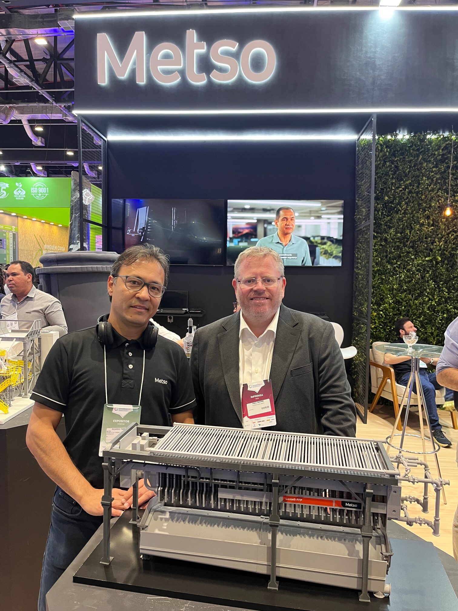 Ricardo Takeda, Sales Director – Minerals for Brazil at Metso with Paul Moore, IM Editorial Director, at Exposibram 2025 with a model of the Metso Larox® FFP filter press