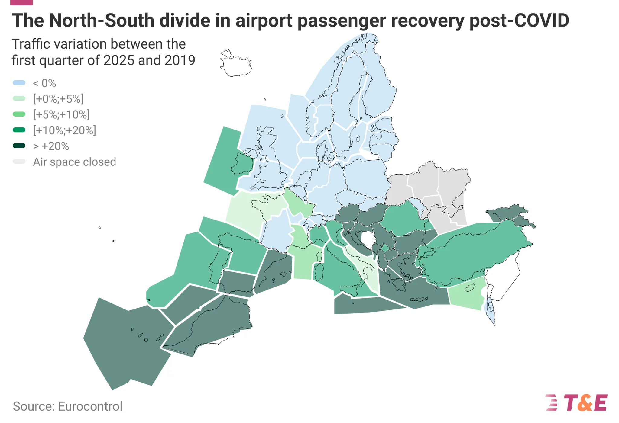 Reduced passenger demand could also be linked to the global decline in business travel after the COVID pandemic. T&E’s Travel Smart Campaign finds that business travel by the world’s biggest companies fell by 34% between 2019 and 2023. Meanwhile, leisure travel is growing in dominance. While business travellers usually fly to economic centres, leisure travel is concentrated towards holiday destinations, increasing air travel to southern European countries by 10 to 20% in 2025, compared to 2019. Overall, trends in travel behavior tend to have a greater impact on passenger demand than taxation and other costs.