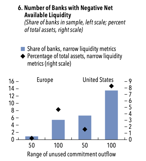 Such large undrawn commitments have left several U.S. banks with negative net available liquidity – a key factor in bank failures. Again, the IMF is referring to the largest U.S. banks.