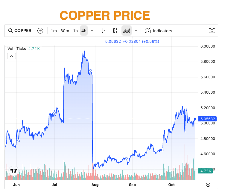 Copper, he argues, lies at the centre of both economic growth and national security. Used in everything from electric grids to military hardware, it has become the lifeblood of modern industry. As of October 2025, copper trades at over $5 per pound — roughly $11,130 per tonne — marking a 55% increase from just five years ago.