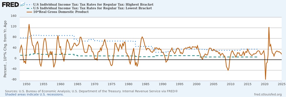 Figure 2—Federal income tax rates (percent) and annual real GDP growth rate (percent x10)