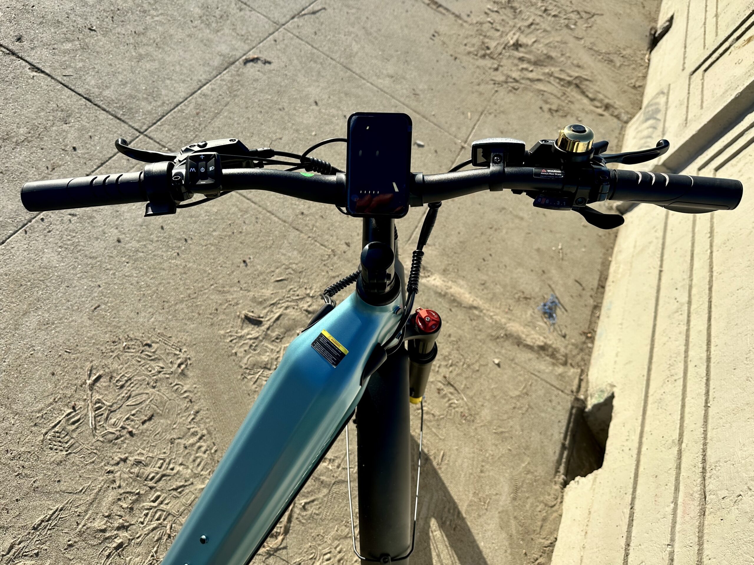 The rack, fenders, aluminum frame, etc., all feel very well-made and sturdy. The bike is sleek and aesthetically pleasing; I love the teal color in the step-through model, as it’s not a color you see often, so it gives the bike a unique vibe. I did some research on the average weight of an e-bike, and this one is on the heavier side at 65 pounds, which makes it a tad unwieldy when transporting it or maneuvering when needed.
