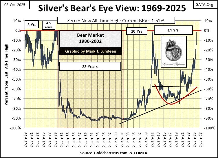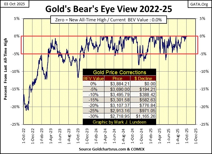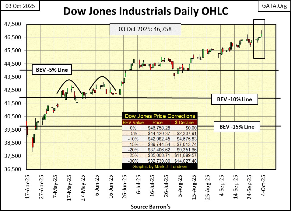 I still like looking at markets using the Bear’s Eye View (BEV), using new all-time highs, and the percentage claw-backs from them. But when studying a market, it is important to study it using different types of charts, to get the full view of the market. Which for the Dow Jones and gold in October 2025, their differences are very dramatic.