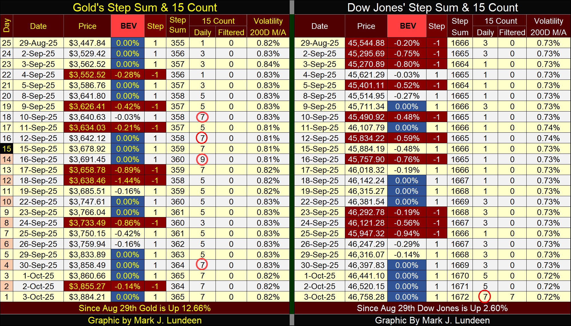 For the Dow Jones in its step sum table, like gold, it too appears very bullish. Lots of blue BEV Zeros to be seen, low daily volatility, and like gold, its 15-count closed the week with a +7. Which isn’t a plus. But something that suggests an increase in daily declines in the weeks to come.