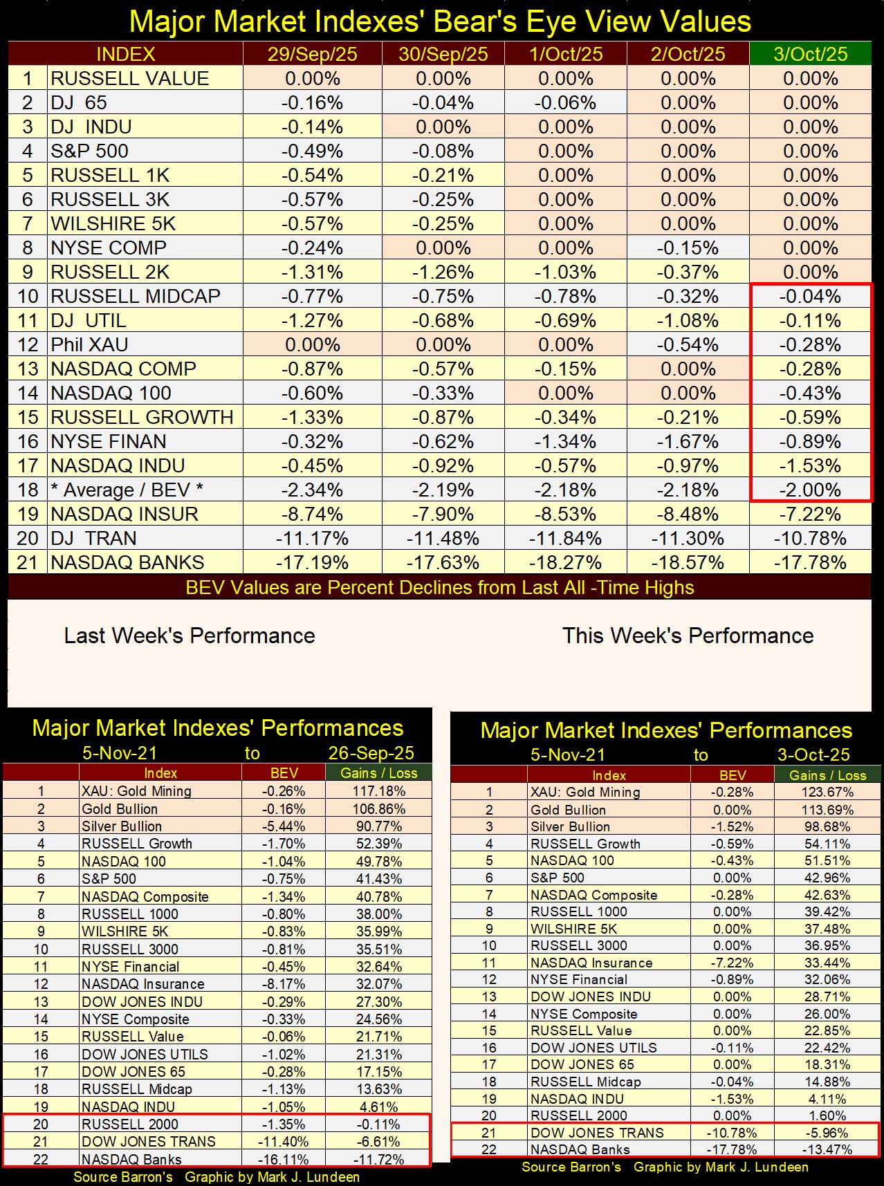 Keep in mind, the stock market is much more than just the thirty-dividend yielding, blue-chip stocks in the Dow Jones. So, let’s now go to my table below showing the BEV values (new all-time highs, and percentage claw-backs from them) of the major market indexes I follow.