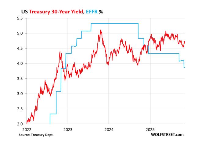 In the two weeks following the October rate cut, the 30-year Treasury yield rose from 4.55 percent to 4.70 percent. It was at 3.94 percent before the rate cut in September 2024. To put that into perspective, the Fed after 150 basis points of Fed rate cuts, the 30-year Treasury was up by 76 basis points.