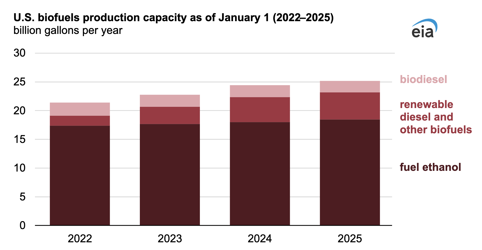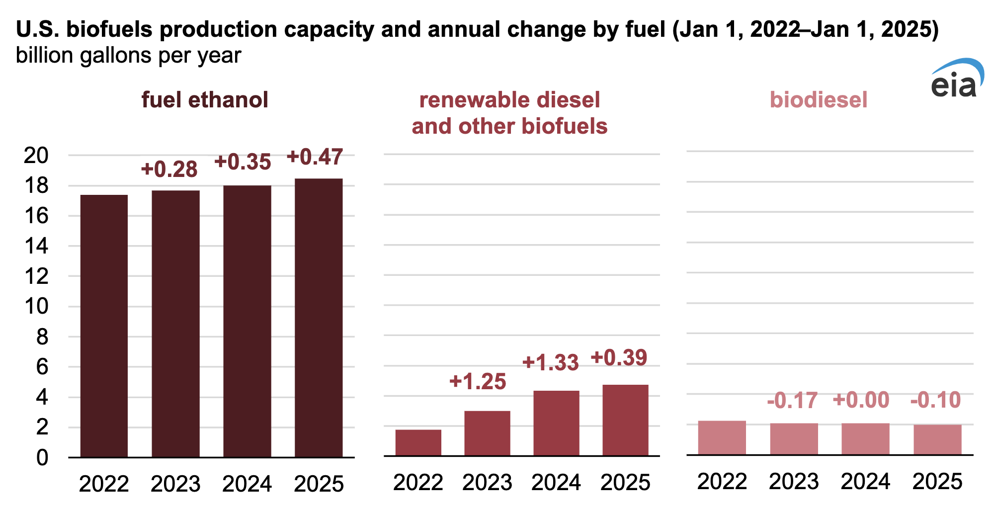 The pace of capacity additions for U.S. biofuel production slowed in 2024, with production capacity increasing by a modest 3% from the start of 2024 to the start of 2025, according to our latest biofuels production capacity reports. A deceleration in production capacity in our category renewable diesel and other biofuels accounted for most of the slowdown in growth. Sustainable aviation fuel (SAF), renewable naphtha, and renewable propane make up virtually all of the other biofuels.