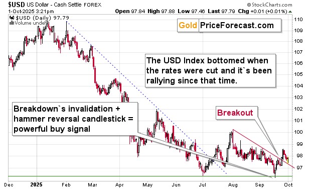 What happened from the technical point of view is actually bullish – the USD just verified its breakout above the declining red resistance line.