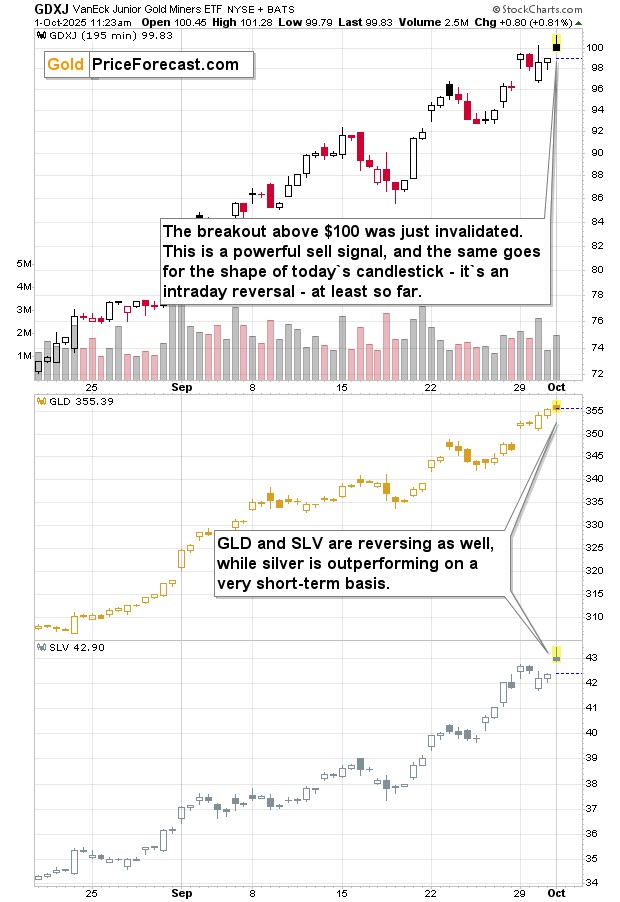 All of them reversed, and GDXJ even invalidated a small breakout above one of the roundest numbers possible – the $100 level. Both are sell signs. If GDXJ closes below $100 today (which seems likely), this powerful sell signal will be complete.