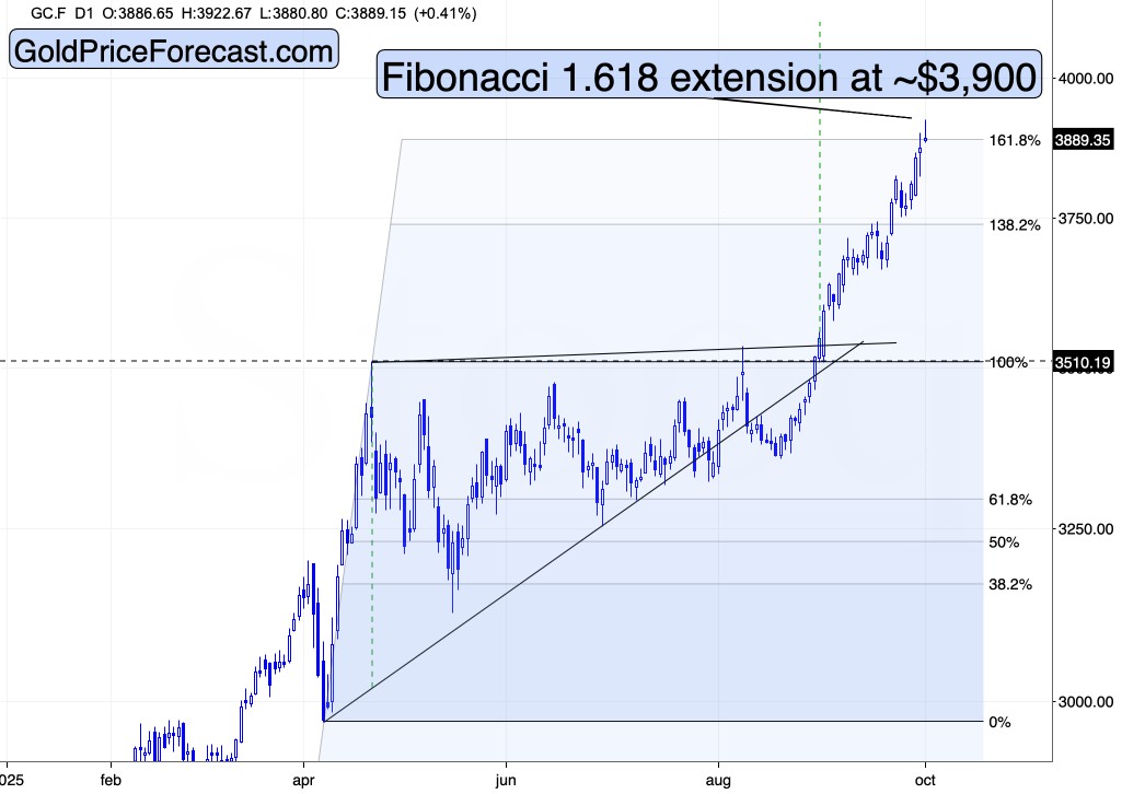 Gold just moved to this level (precisely to $3,899.15) and then it declined – erasing more than the entire overnight gains. This happened while the USD Index was insignificantly down. Gold is likely in the final blow-off part of the speculative parabolic upswing, and it’s “doing its own thing”.