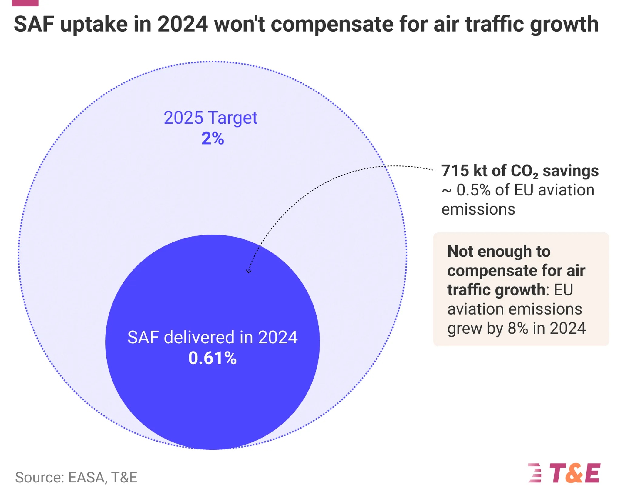 - Climate benefits undermined by air traffic growth: SAF deliveries in 2024 avoided 714,000 tonnes of CO₂ emissions — equivalent to just 0.5% of the sector’s total emissions. Yet European aviation emissions as a whole rose by 8% last year due to increasing traffic.