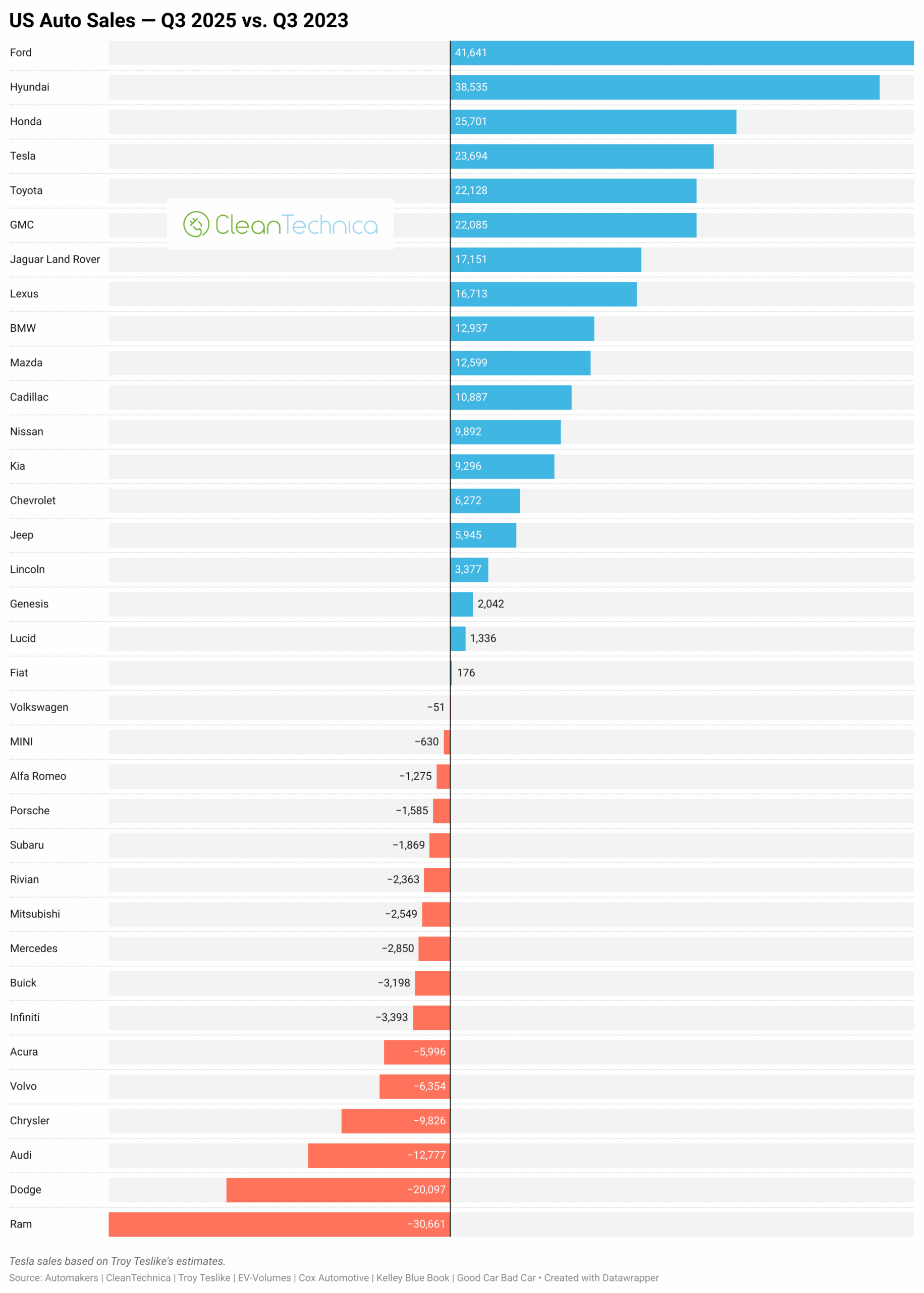 Comparing to Q3 2023, Ford and Hyundai stand out for their growth on a volume basis, with Honda and Tesla following a bit behind in 3rd and 4th. On a percentage basis, little companies with big relative growth led the chart — Fiat, Jaguar Land Rover, and Lucid. Yes, Lucid! Tesla was actually down in 10th in that regard.