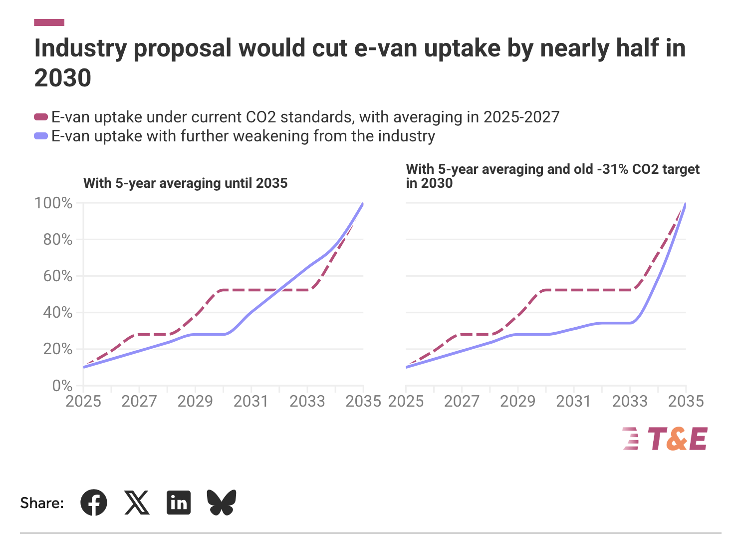 Under ACEA’s proposed weakening, only 28% of new vans could be electric in 2030, instead of 52% under current CO2 standards. This would cut the expected e-van uptake in 2030 by nearly half.