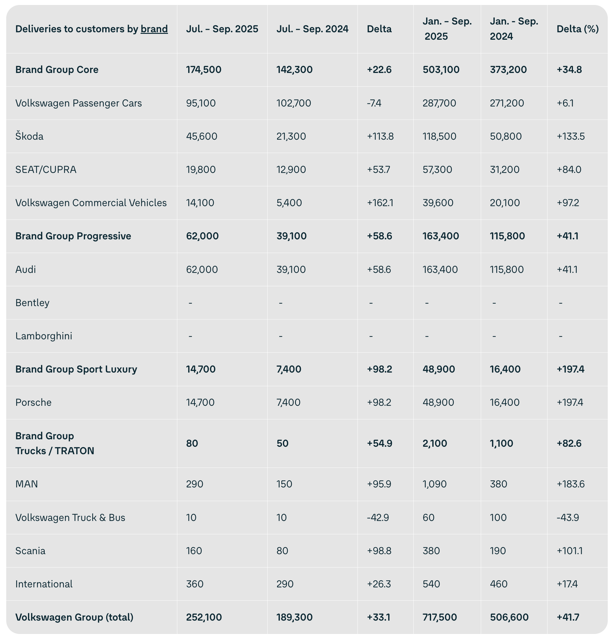 Volkswagen Group — which includes Volkswagen, Audi, Porsche, Skoda, Seat, and other brands — boasted 717,500 BEV deliveries so far by the end of September. That’s up 42% from 506,600 deliveries in the same period in 2024.