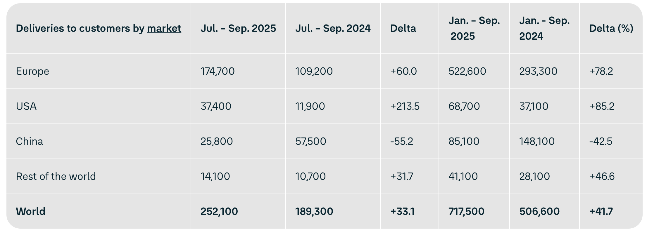 “Strong increase in BEV deliveries in Europe (+78 percent) and the USA (+85 percent), decline in China (-43 percent) as planned ahead of the launch of new electric models; Volkswagen Group is the clear BEV market leader in Europe (market share of around 27 percent); global BEV share after three quarters rises significantly from 8 to 11 percent compared to the previous year, climbing from 12 to 20 percent in Western Europe.”